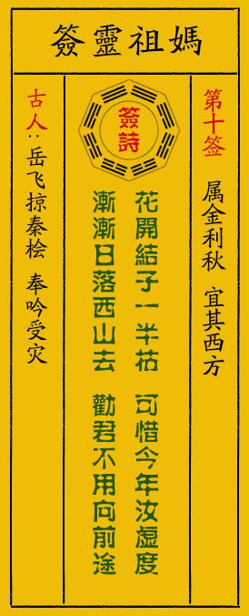 【台湾北海观音明善堂】开花结果,却是一半落空,收获不多,可惜你今年的光阴算是虚度了,太阳渐渐向西山落去,所谓:“夕阳无限好,只是近黄昏”,劝你定下心来拜神来增添福报,看开一点吧,还是不用再劳心劳力奔波了。求得此签暗示目前福报平平。问事求谋事倍功半。只宜守成。问出外,空劳往返,所以不吉。问婚姻,因签有结子一半枯,今年汝虚渡之句,恐怕难成。移居、变动职位,均不吉。问疾病,元辰暗淡有五鬼阴邪作祟,老幼危险宜消灾。 【台湾育德妈祖同修会】开花结果,即是一半落空,收获不多,可惜你今年的光阴算是处度了。太阳渐渐向西山落去,俗云:“太阳虽好近黄昏”,劝你呀,看开点一吧,还是不用再奔波了!这首签诗暗示当事人徒劳无功,虽然过去有一段辉煌的日子,但结果成就却不多,有一半以上是虚掷光阴了。所以签诗劝他,还是脚踏实地,做些实在的事,何必去空忙一场呢?抽到此签,问出外,正如签诗所说,空劳往返,所以不吉。问婚姻,因签有“结子一枯,今年汝虚度”之句,恐怕难成。移居、变动职位,均不吉。 |