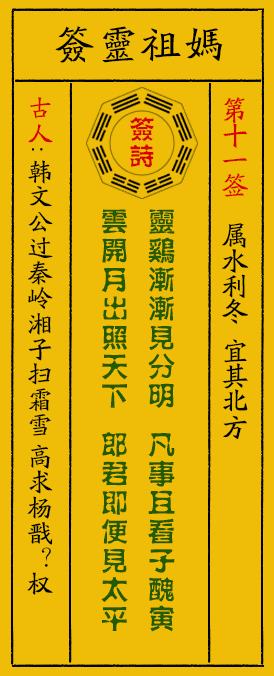 诗曰 | 灵鸡渐渐见分明、凡事且看子丑寅、云开月出照天下、郎君即便见太平。 |