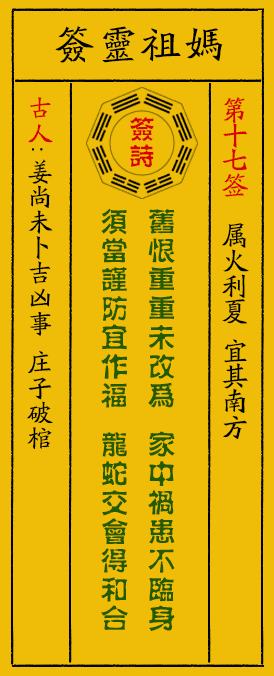 解曰 | 讨海:微利运不辰。 作塭:运不合求小利。 鱼苗:微利。 求财:轻微勤俭必得。 耕作:平平小利。 经商:平平忠直能得。 月令:不畏渐渐平安。 六甲:先男后女。 婚姻:成者大吉。 家运:居之则安。 失物:难寻。 寻人:待时。 远信:慢。 六畜:纳者不可。 筑室:有犯阴邪。 移居:随意不可。 坟墓:平平小吉。 出外:辰己日可。 行舟:平平财轻。 凡事:人害紧和无事。 治病:求神庇佑辰未日过渐愈。 作事:先难后易。 功名:修阴德必中。 官事:和为贵不和凶。 家事:和为贵。 求儿:不可。 |