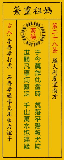 【台湾北海观音明善堂】好汉不提当年勇,此一时,彼一时也,不要再提过去,就像老虎,一落平地时,英雄无用武之地,连小犬都敢欺负他。世事难料,有什么难以决定的呢?就是前方有千山万水的困难,也不必迟疑,勇往直前吧。求得此签暗示目前福报已尽,问事求谋拖尾难成,人力难回天。当思求神作福补禄,问财利,应该积极进取,历千山万水辛苦得来。若问功名,此签有才能而不遇,就像“虎落平阳”,英雄无用武之地。问婚姻,恐有阻碍、或受欺侮,难于成婚,宜另找适当的对像。移居、出外均不可。问疾病,运逢白虎当道防意外危险有阴邪元辰暗淡,宜解厄消灾。 【台湾育德妈祖同修会】英雄好汉莫提当年勇,此一时,彼一时,不要将现时仍与当年比。就像那老虎,一落到平地里,英雄无用武之地,连小犬都敢欺负他。世间上的事,有什么难于决定的呢?就是千山万水的困难,也不必迟疑,就决定永往直前吧。抽到此签,问求财,应该积极进取,自然财源如“千山万水”源源而来。但若问功名,此签有怀才不遇、“虎落平洋”、英雄无用武之地的感叹。问婚姻,恐阻碍重重,难于谈成,宜另找适当的对象。移居、出外,均不吉,如非紧急要事,宜暂缓行动。有赵某应聘出国,临行抽得此签求问吉凶,佘曰:“此去恐无甚发展,最好不应聘。”他说机票已订,乃后天班机,不能变更。后来落魄返国,悔当时未谈妥条件,致出国后被剥削,无法反抗也,正应了:“虎落平洋被犬欺”。 |