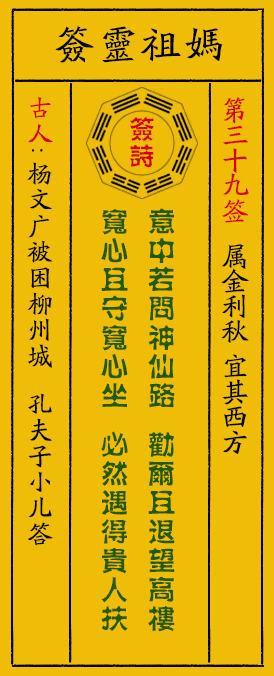 【台湾北海观音明善堂】不须太过执着目前的处境。只要坚定自己心中的目标,光明正大不偏不倚,名位自然显达圆满。不须要向神祈求,心里自然安祥。只要看看那早晚太阳的升沉,就会领悟到天地循环的道理,才能即时得意在其间。此签,乃告诉我们做人处世不宜太偏激执着,日有阴晴圆缺人有旦夕祸福,无须为一时的不如意太过在意。应采取乐观进取的态度,坚持目标循序渐进,常以失为得,自然能悠闲自得不会患得患失。求得此签暗示目前福报平平,问事求谋,需按部就班,不可冒进而增加无谓的困扰。问求财,宜守旧,不可贪求。心存正直。自然无忧。问谋事,虽有成功的希望,但时间上恐会拖延。谈婚姻,较迟。问诉讼,则以和解为宜。问疾病,未安,宜求神消灾解厄痊愈。 【台湾育德妈祖同修会】坚守中正立场,不偏不倚,名位自然显。不须向神祈求,心里自然安祥。看看那早晚太阳的升沉,就会领悟到,惟有坚守中间立场,才能即使得意起来。此签原意,乃告诉当事人,处世做人不宜太偏激,应该采取中庸的态度,这样,才能获得心安理得,人家也自然会敬重起你来。抽到此签,问求财,宜守旧,不可贪求。心中存着正直,自然无忧。问谋事,虽有成功的希望,但时间上恐久延。谈婚姻,在时间上为宜。问疾病,目前还无法痊愈,尚须待一段时间。友人张君,报名参加高考,不知能否高中,乃赴妈祖庙抽得此签。后高中金榜,分发经济部服务。经济部属中央级机关,正应了“名显有意在中央”句,真妙哉! |