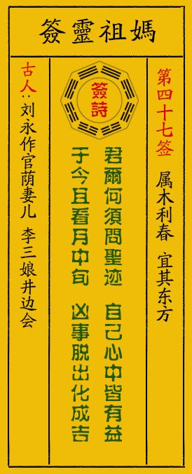 【台湾北海观音明善堂】只要你心地光明,何必求神问卜呢?对事情也没有任何的益处。你所担心的事,要等到月中才有转机,才有逢凶化吉的希望。一个人只要问心无愧的去做事,不必求神念佛,神佛也会暗中保佑你,自然会逢凶化吉,本签诗一开头,要当事人先修心,自然有益,就是这个道理。求得此签暗示虽然目前福报不足却可得到神明相助逢凶化吉,问事求谋可成。问财利,只要努力经营,必可获利。问功名,此次若未能得中,再接再厉,下次一定有希望。问婚姻,过了月半以后继续努力,有情人终成眷属。问诉讼,要拖一段时间,才能逢凶化吉。移居出外,安好可行。问疾病,未安,宜求神消灾解厄不畏。 【台湾育德妈祖同修会】你何必去求卜问神呢?只要你心中光明,自然有益。你所担心的事,要等到月中才有转机,才有逢凶化吉的希望,现在,尽其在我去做就是了。一个人只要问心无愧的去做事,不必求神佛,神佛也会暗中保佑你,自然会逢凶化吉,所谓吉人自有天相。本签诗一开头,要当事人先修心,自然有益,就是这个道理。抽到此签问财利,只要认真经营,必可获利。只要认真经营,必可获利。问功名,此次若未能得中,再接再厉,下次一定有希望。问婚姻,过了半月以后,继续努力,有情人终成眷属。问诉讼,也是要拖一段时间,才能逢凶化吉。移居出外,安好可行。某月初,有一诉讼当事人特此签来问,谓因工厂司机肇祸,赔偿问题未能解决,不知吉凶如何?佘曰:“照此签所示,月中应可解决。”后果然于月中达成协议,以十万元和解。盖签中有“于今且看月中旬,凶事脱出化成吉”句,故作此判断。 |