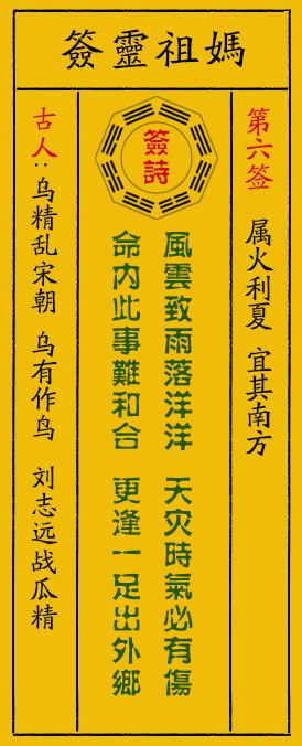 【台湾北海观音明善堂】风云招来豪雨,汪洋一片,命运造成了伤害。一个人命里无时莫强求,既然没有和合的希望,就不必再出外奔波了。这首签诗,告诉当事人:“命里有时终须有,命里无时莫强求。”如果命中福报不足,强求也没有用的,就像那不测的风雨造成天灾,乃是一种不可抗拒的灾害,是无可奈何的。唯有平时多拜神累积福报。求得此签暗示目前福报不佳,问事求谋拖尾难成。问求财,无希望,勿去强求。问诉讼,宜和解,莫逞强。问婚姻,另找对像问迁移,不可妄动。问疾病,宜消灾。地有阴邪,老幼危险。 【台湾育德妈祖同修会】风云招来暴雨,一片汪洋,天灾气候造成了伤害。一个人命里无时莫强求,即然没有和合的希望,就不必再出外奔跑了。这首签诗,告示当事人:“命里有时终是有,命里无时莫强求。”强求也是没有用的,就像那不测风云造成的天灾,乃是一种不可抗力的灾害,是莫可耐何呀!这首签诗,如果是要问合伙,乃不吉之兆。因诗中有“命内此事难和合”之句。据友人张君说,他与人合伙设立工厂时,曾到妈祖庙抽到此签,当时曾想作罢,后因筹备已久,所费不少,乃勉强凑合。后来该工厂合伙人,竟该厂帐款拐逃国外,正应了“更逢一足出外乡”之句。抽到此签,问求财,不吉,无利可图。问婚姻,莫强求,宜另找对象。问谋望,只要心平静气,顺其自然,莫要强求,自然祸去福来。问诉讼,宜和解,莫信谗言。问迁移和变动职位,不可妄动。 |