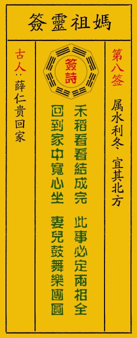 【台湾北海观音明善堂】田里的稻穗累累,辛苦的汗水与耕耘,将有丰盛的收获。看到好的收成,心中的忧虑烦恼尽除,终于可以安心的回到家里跟妻儿们快快乐乐地载歌载舞。这首签诗表示,有一分耕耘,终有一分收获。昔日流汗,今天总算看到丰收了。但如果没有往日的流汗,那有今天的收成呢?求得此签暗示目前福报俱足,问事求谋大抵先苦后甘,先否后泰。问婚姻,表示有情人终成眷属。问事业,要脚踏实地去做,不可投机,投机必败。问功名,如在秋天,有希望,如在冬天,须待明年。问疾病,宜消灾,老危险。 【台湾育德妈祖同修会】看看田里结成了稻穗,知道今年又丰收了。辛勤的耕耘,必有丰盛的收获,这事是两相关的呀!看好的收成,心中多高兴,回到家里来,跟妻儿们同在一起,快快乐乐地跳舞一番!这首签诗是一首好签,表示有一分耕芸,终有一分收获。俗云:“大富由天,小富由勤俭。”昔日的流汗,今天总看到丰满的收成了。但如果没有昔日的流汗,那有今天的收成呢?抽到此签,大抵先苦后甘,先否后泰。如果是问婚姻,表示有情人终成眷属。问事业,要脚踏实地去做,不可做投机,投机必失败。问功名,如果在秋天,有希望。如果在冬天,须待明年,再充实自己。 |